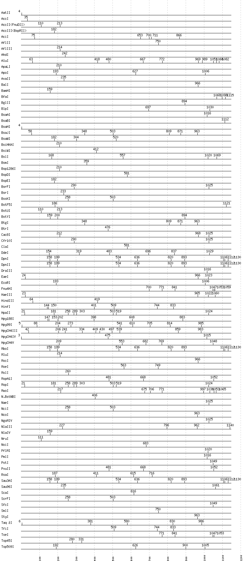 Uncut enzymes: Acc65I, AclI, AfeI, AgeI, AlwI, AlwNI, Aor51HI(Eco47III), ApaI, AscI, AseI, AvaI, AvrII, BaeI, BanI, BanII, BbsI, BbvCI, BbvI, BcgI, BciVI, BclI, BglI, BmrI, BpmI, BsaI, BsaXI, BseRI, BsgI, BsiEI, BsmAI, BsmBI, BsmFI, BsoBI, BspHI, BspMI, BspT107I(HgiCI), BsrBI, BsrDI, BsrGI, BssHII, BssSI, BstAPI, BstBI, BstEII, BstNI, BstXI, BstZ17I, Bsu36I, BtsI, DraI, DrdI, EagI, EarI, EciI, EcoNI, EcoO109I, EcoRV, FauI, FokI, FseI, FspI, HaeII, HgaI, HhaI, HinP1I, HincII, HpaI, HphI, I-CeuI, I-SceI, KasI, KpnI, MboII, MfeI, MlyI, MnlI, , NarI, NdeI, NheI, NotI, NspI, PI-PspI, PI-SceI(VDE), PacI, PaeR7I, PciI, PflFI, PleI, PmeI, PpuMI, PshAI, PsiI, PspGI, PspOMI, PvuI, RsrII, SacI, SacII, SalI, SapI, SbfI, SexAI, SfaNI, SfiI, SfoI, SgrAI, SmaI, SnaBI, SpeI, SphI, SspI, StuI, SwaI, TliI, TspRI, Tth111I, XbaI, XcmI, XhoI, XmaI, XmnI