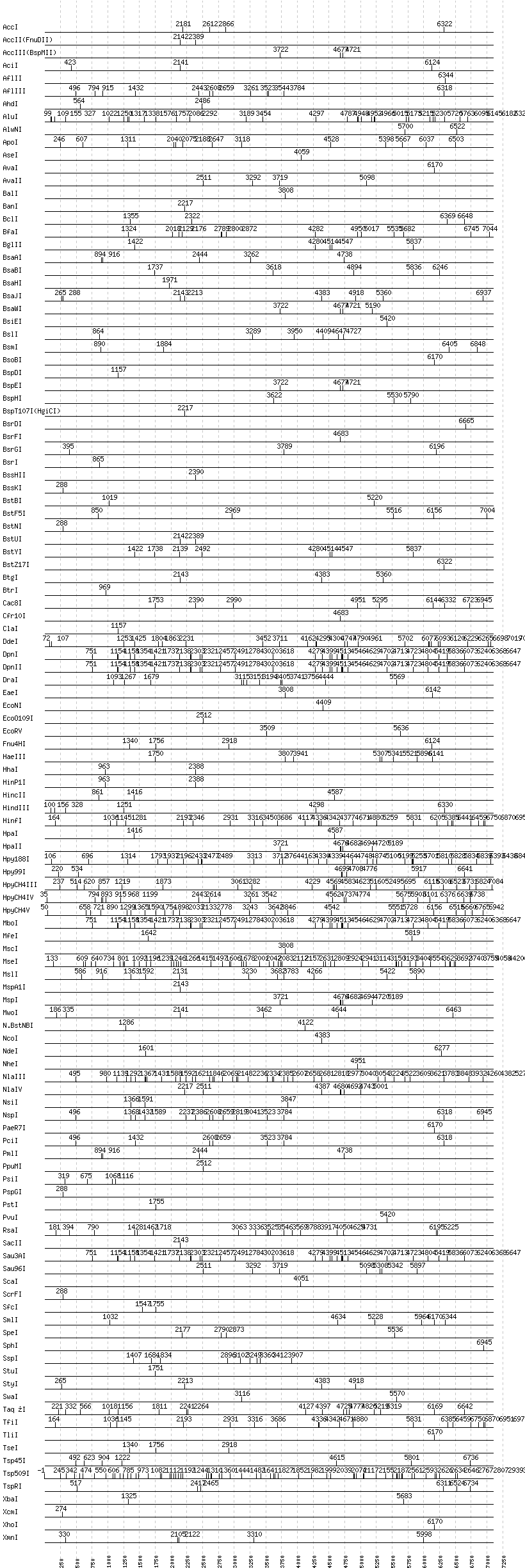 Uncut enzymes: AatII, Acc65I, AclI, AfeI, AgeI, AlwI, Aor51HI(Eco47III), ApaI, ApaLI, AscI, AvrII, BaeI, BamHI, BanII, BbsI, BbvCI, BbvI, BcgI, BciVI, BglI, BlpI, BmrI, BpmI, BsaI, BsaXI, BseRI, BsgI, BsiHKAI, BsiWI, BsmAI, BsmBI, BsmFI, Bsp1286I, BspMI, BsrBI, BssSI, BstAPI, BstEII, BstXI, Bsu36I, BtsI, DraIII, DrdI, EagI, EarI, EciI, EcoRI, FauI, FokI, FseI, FspI, HaeII, HgaI, HphI, I-CeuI, I-SceI, KasI, KpnI, MboII, MluI, MlyI, MnlI, NaeI, , NarI, NciI, NgoMIV, NotI, NruI, PI-PspI, PI-SceI(VDE), PacI, PflFI, PflMI, PleI, PmeI, PshAI, PspOMI, PvuII, RsrII, SacI, SalI, SapI, SbfI, SexAI, SfaNI, SfiI, SfoI, SgrAI, SmaI, SnaBI, Tth111I, XmaI
