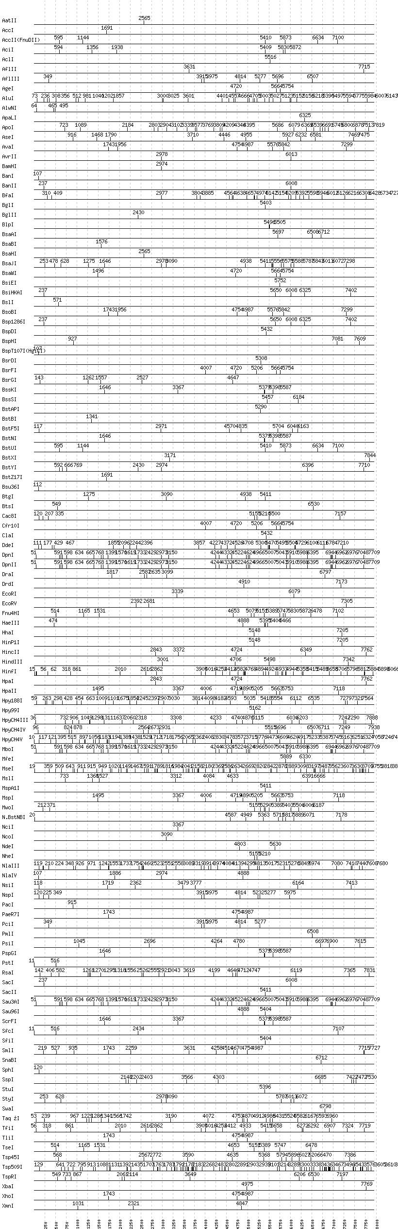 Uncut enzymes: Acc65I, AccIII(BspMII), AfeI, AhdI, AlwI, Aor51HI(Eco47III), ApaI, AscI, AvaII, BaeI, BalI, BbsI, BbvCI, BbvI, BcgI, BciVI, BclI, BmrI, BpmI, BsaI, BsaXI, BseRI, BsgI, BsiWI, BsmAI, BsmBI, BsmFI, BsmI, BspEI, BspMI, BsrBI, BsrI, BssHII, BstEII, BtrI, DraIII, EaeI, EagI, EarI, EciI, EcoNI, EcoO109I, FauI, FokI, FseI, FspI, HaeII, HgaI, HphI, I-CeuI, I-SceI, KasI, KpnI, MboII, MluI, MlyI, MnlI, MscI, NaeI, , NarI, NgoMIV, NotI, NruI, PI-PspI, PI-SceI(VDE), PflFI, PflMI, PleI, PmeI, PpuMI, PshAI, PspOMI, PvuI, PvuII, RsrII, SalI, SapI, SbfI, ScaI, SexAI, SfaNI, SfoI, SgrAI, SmaI, SpeI, Tth111I, XcmI, XmaI