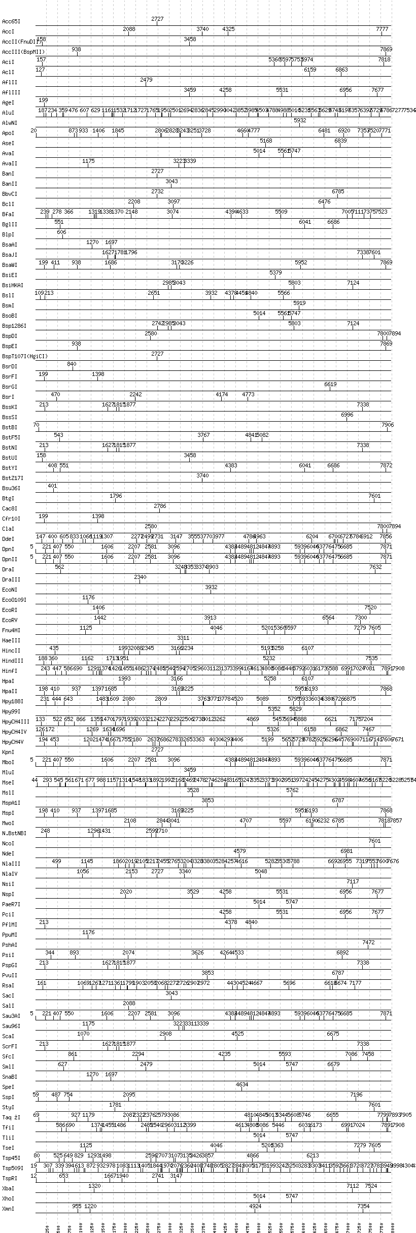 Uncut enzymes: AatII, AfeI, AhdI, AlwI, Aor51HI(Eco47III), ApaI, ApaLI, AscI, AvrII, BaeI, BalI, BamHI, BbsI, BbvI, BcgI, BciVI, BglI, BmrI, BpmI, BsaBI, BsaHI, BsaI, BsaXI, BseRI, BsgI, BsiWI, BsmAI, BsmBI, BsmFI, BspHI, BspMI, BsrBI, BssHII, BstAPI, BstEII, BstXI, BtrI, BtsI, DrdI, EaeI, EagI, EarI, EciI, FauI, FokI, FseI, FspI, HaeII, HgaI, HhaI, HinP1I, HphI, I-CeuI, I-SceI, KasI, MboII, MfeI, MlyI, MnlI, MscI, NaeI, , NarI, NciI, NgoMIV, NheI, NotI, NruI, PI-PspI, PI-SceI(VDE), PacI, PflFI, PleI, PmeI, PmlI, PspOMI, PstI, PvuI, RsrII, SacII, SapI, SbfI, SexAI, SfaNI, SfiI, SfoI, SgrAI, SmaI, SphI, StuI, SwaI, Tth111I, XcmI, XmaI