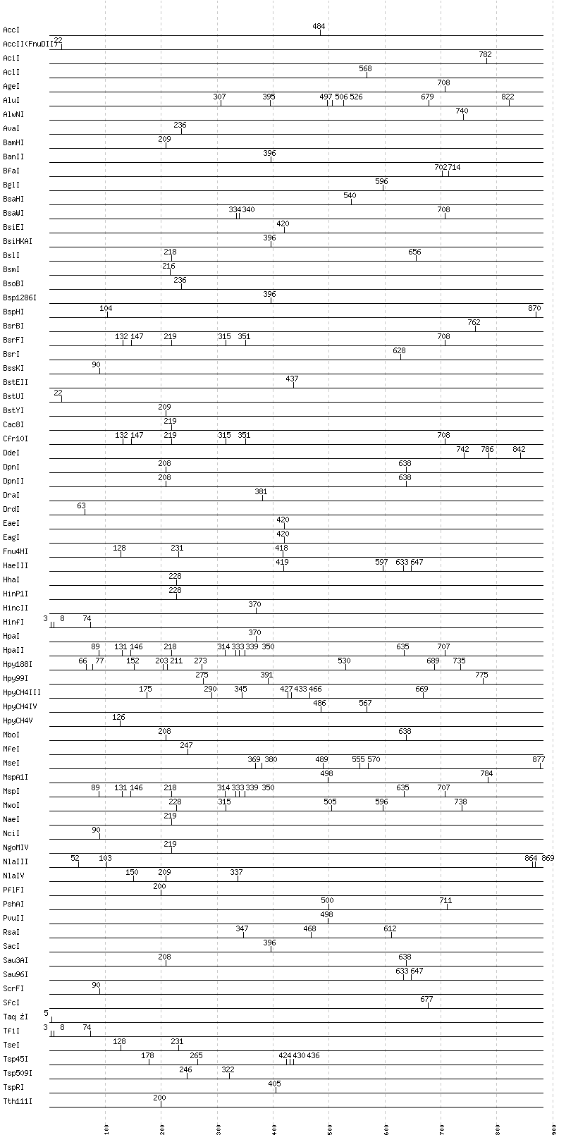 Uncut enzymes: AatII, Acc65I, AccIII(BspMII), AfeI, AflII, AflIII, AhdI, AlwI, Aor51HI(Eco47III), ApaI, ApaLI, ApoI, AscI, AseI, AvaII, AvrII, BaeI, BalI, BanI, BbsI, BbvCI, BbvI, BcgI, BciVI, BclI, BglII, BlpI, BmrI, BpmI, BsaAI, BsaBI, BsaI, BsaJI, BsaXI, BseRI, BsgI, BsiWI, BsmAI, BsmBI, BsmFI, BspDI, BspEI, BspMI, BspT107I(HgiCI), BsrDI, BsrGI, BssHII, BssSI, BstAPI, BstBI, BstF5I, BstNI, BstXI, BstZ17I, Bsu36I, BtgI, BtrI, BtsI, ClaI, DraIII, EarI, EciI, EcoNI, EcoO109I, EcoRI, EcoRV, FauI, FokI, FseI, FspI, HaeII, HgaI, HindIII, HphI, I-CeuI, I-SceI, KasI, KpnI, MboII, MluI, MlyI, MnlI, MscI, MslI, N.BstNBI, , NarI, NcoI, NdeI, NheI, NotI, NruI, NsiI, NspI, PI-PspI, PI-SceI(VDE), PacI, PaeR7I, PciI, PflMI, PleI, PmeI, PmlI, PpuMI, PsiI, PspGI, PspOMI, PstI, PvuI, RsrII, SacII, SalI, SapI, SbfI, ScaI, SexAI, SfaNI, SfiI, SfoI, SgrAI, SmaI, SmlI, SnaBI, SpeI, SphI, SspI, StuI, StyI, SwaI, TliI, XbaI, XcmI, XhoI, XmaI, XmnI
