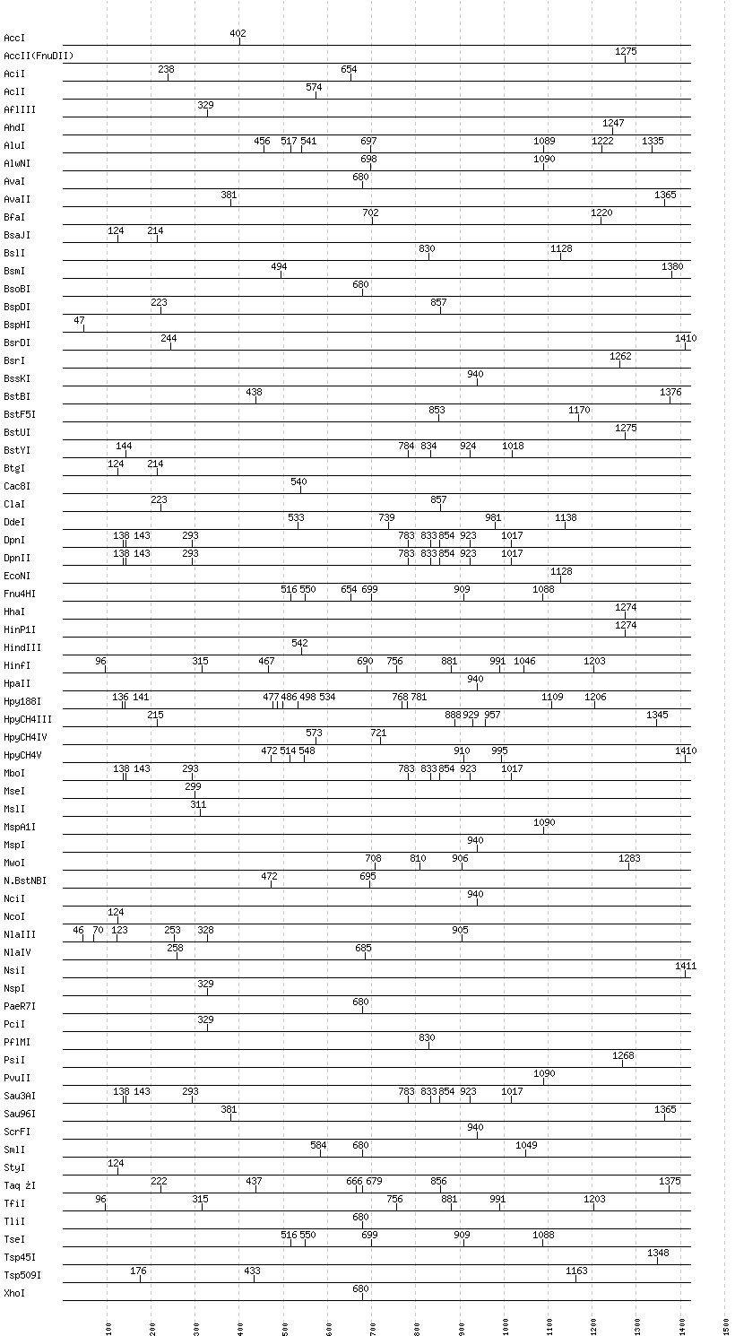 Uncut enzymes: AatII, Acc65I, AccI, AccII(FnuDII), AccIII(BspMII), AciI, AclI, AfeI, AflII, AflIII, AgeI, AhdI, AlwI, AlwNI, Aor51HI(Eco47III), ApaI, ApaLI, ApoI, AscI, AseI, AvaI, AvaII, AvrII, BaeI, BalI, BamHI, BanI, BanII, BbsI, BbvCI, BbvI, BcgI, BciVI, BclI, BglI, BlpI, BmrI, BpmI, BsaAI, BsaBI, BsaI, BsaJI, BsaWI, BsaXI, BseRI, BsgI, BsiEI, BsiHKAI, BsiWI, BslI, BsmAI, BsmBI, BsmFI, BsmI, BsoBI, Bsp1286I, BspDI, BspEI, BspHI, BspMI, BspT107I(HgiCI), BsrBI, BsrDI, BsrFI, BsrI, BssHII, BssSI, BstAPI, BstEII, BstF5I, BstUI, BstXI, BstZ17I, Bsu36I, BtgI, BtrI, BtsI, Cfr10I, ClaI, DdeI, DraI, DraIII, DrdI, EaeI, EagI, EarI, EciI, EcoNI, EcoO109I, EcoRI, EcoRV, FauI, Fnu4HI, FokI, FseI, FspI, HaeII, HaeIII, HgaI, HhaI, HinP1I, HincII, HindIII, HpaI, HpaII, HphI, HpyCH4IV, HpyCH4V, I-CeuI, I-SceI, KasI, KpnI, MboII, MfeI, MluI, MlyI, MnlI, MscI, MseI, MslI, MspA1I, MspI, MwoI, N.BstNBI, NaeI, , NarI, NciI, NcoI, NdeI, NgoMIV, NheI, NlaIV, NotI, NruI, NsiI, NspI, PI-PspI, PI-SceI(VDE), PacI, PaeR7I, PciI, PflFI, PflMI, PleI, PmeI, PmlI, PpuMI, PsiI, PspOMI, PstI, PvuI, PvuII, RsrII, SacI, SacII, SalI, SapI, Sau96I, SbfI, ScaI, SexAI, SfaNI, SfcI, SfiI, SfoI, SgrAI, SmaI, SmlI, SnaBI, SpeI, SphI, SspI, StuI, StyI, SwaI, TfiI, TliI, TseI, Tsp45I, Tsp509I, Tth111I, XbaI, XcmI, XhoI, XmaI, XmnI