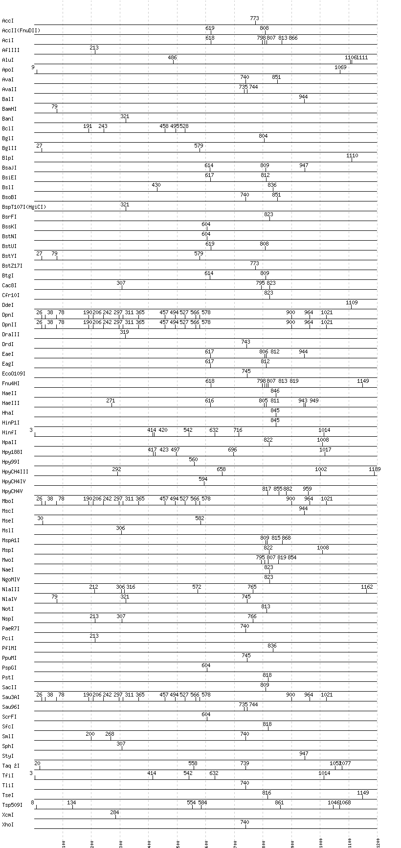 Uncut enzymes: AatII, Acc65I, AccIII(BspMII), AclI, AfeI, AflII, AgeI, AhdI, AlwI, AlwNI, Aor51HI(Eco47III), ApaI, ApaLI, AscI, AseI, AvrII, BaeI, BanII, BbsI, BbvCI, BbvI, BcgI, BciVI, BfaI, BmrI, BpmI, BsaAI, BsaBI, BsaHI, BsaI, BsaWI, BsaXI, BseRI, BsgI, BsiHKAI, BsiWI, BsmAI, BsmBI, BsmFI, BsmI, Bsp1286I, BspDI, BspEI, BspHI, BspMI, BsrBI, BsrDI, BsrGI, BsrI, BssHII, BssSI, BstAPI, BstBI, BstEII, BstF5I, BstXI, Bsu36I, BtrI, BtsI, ClaI, DraI, EarI, EciI, EcoNI, EcoRI, EcoRV, FauI, FokI, FseI, FspI, HgaI, HincII, HindIII, HpaI, HphI, I-CeuI, I-SceI, KasI, KpnI, MboII, MfeI, MluI, MlyI, MnlI, N.BstNBI, , NarI, NciI, NcoI, NdeI, NheI, NruI, NsiI, PI-PspI, PI-SceI(VDE), PacI, PflFI, PleI, PmeI, PmlI, PshAI, PsiI, PspOMI, PvuI, PvuII, RsaI, RsrII, SacI, SalI, SapI, SbfI, ScaI, SexAI, SfaNI, SfiI, SfoI, SgrAI, SmaI, SnaBI, SpeI, SspI, StuI, SwaI, Tsp45I, TspRI, Tth111I, XbaI, XmaI, XmnI
