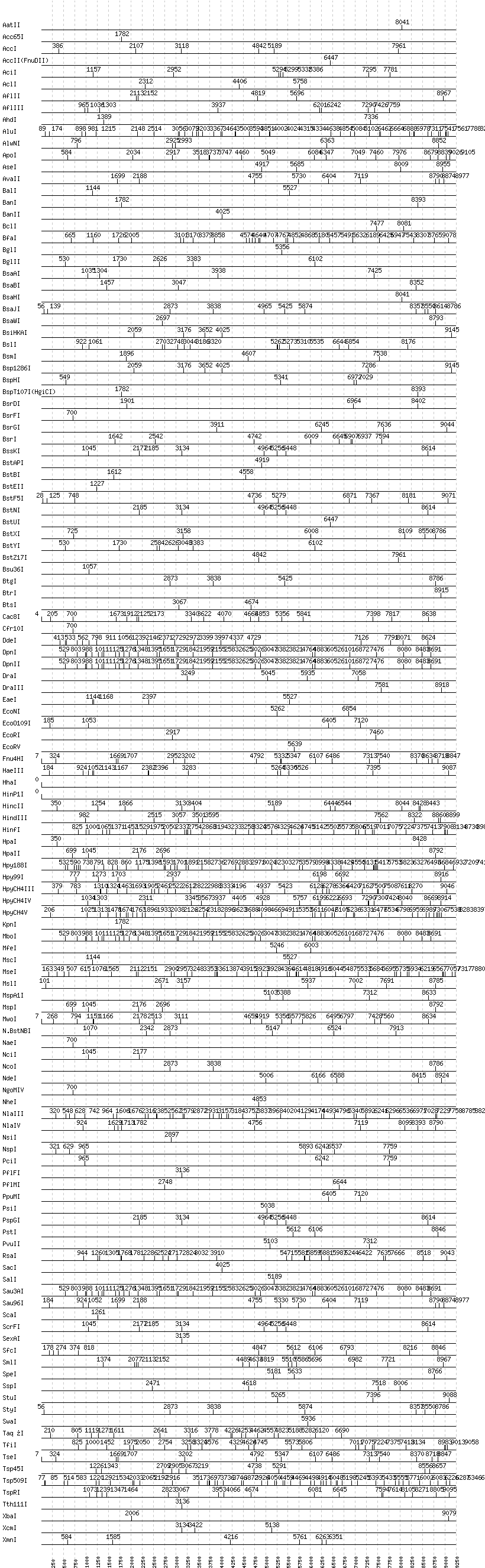 Uncut enzymes: AccIII(BspMII), AfeI, AgeI, AlwI, Aor51HI(Eco47III), ApaI, ApaLI, AscI, AvaI, AvrII, BaeI, BamHI, BbsI, BbvCI, BbvI, BcgI, BciVI, BlpI, BmrI, BpmI, BsaI, BsaXI, BseRI, BsgI, BsiEI, BsiWI, BsmAI, BsmBI, BsmFI, BsoBI, BspDI, BspEI, BspMI, BsrBI, BssHII, BssSI, ClaI, DrdI, EagI, EarI, EciI, FauI, FokI, FseI, FspI, HaeII, HgaI, HphI, I-CeuI, I-SceI, KasI, MboII, MluI, MlyI, MnlI, , NarI, NotI, NruI, PI-PspI, PI-SceI(VDE), PacI, PaeR7I, PleI, PmeI, PmlI, PshAI, PspOMI, PvuI, RsrII, SacII, SapI, SbfI, SfaNI, SfiI, SfoI, SgrAI, SmaI, SnaBI, SphI, TliI, XhoI, XmaI