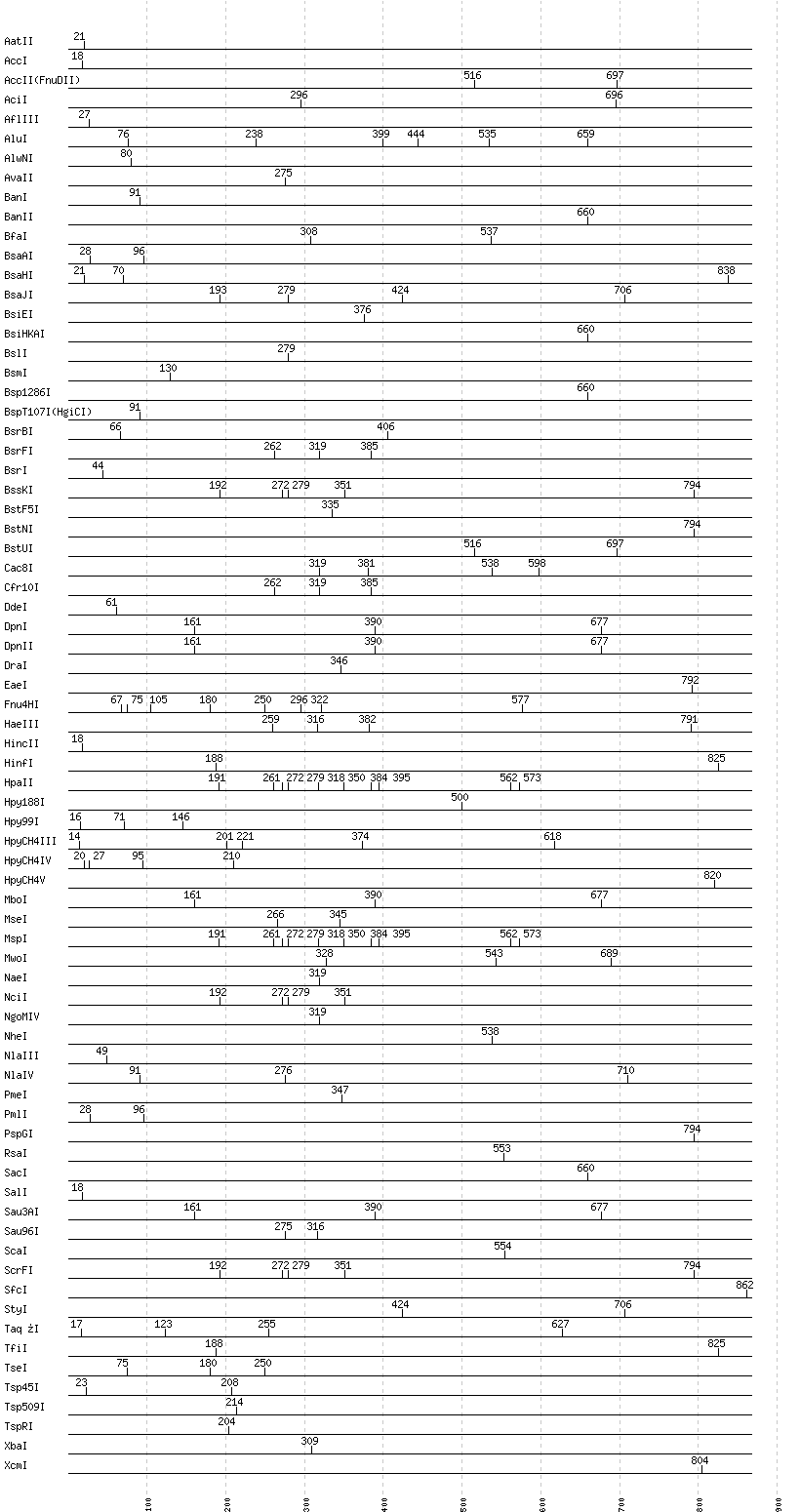 Uncut enzymes: Acc65I, AccIII(BspMII), AclI, AfeI, AflII, AgeI, AhdI, AlwI, Aor51HI(Eco47III), ApaI, ApaLI, ApoI, AscI, AseI, AvaI, AvrII, BaeI, BalI, BamHI, BbsI, BbvCI, BbvI, BcgI, BciVI, BclI, BglI, BglII, BlpI, BmrI, BpmI, BsaBI, BsaI, BsaWI, BsaXI, BseRI, BsgI, BsiWI, BsmAI, BsmBI, BsmFI, BsoBI, BspDI, BspEI, BspHI, BspMI, BsrDI, BsrGI, BssHII, BssSI, BstAPI, BstBI, BstEII, BstXI, BstYI, BstZ17I, Bsu36I, BtgI, BtrI, BtsI, ClaI, DraIII, DrdI, EagI, EarI, EciI, EcoNI, EcoO109I, EcoRI, EcoRV, FauI, FokI, FseI, FspI, HaeII, HgaI, HhaI, HinP1I, HindIII, HpaI, HphI, I-CeuI, I-SceI, KasI, KpnI, MboII, MfeI, MluI, MlyI, MnlI, MscI, MslI, MspA1I, N.BstNBI, , NarI, NcoI, NdeI, NotI, NruI, NsiI, NspI, PI-PspI, PI-SceI(VDE), PacI, PaeR7I, PciI, PflFI, PflMI, PleI, PpuMI, PshAI, PsiI, PspOMI, PstI, PvuI, PvuII, RsrII, SacII, SapI, SbfI, SexAI, SfaNI, SfiI, SfoI, SgrAI, SmaI, SmlI, SnaBI, SpeI, SphI, SspI, StuI, SwaI, TliI, Tth111I, XhoI, XmaI, XmnI