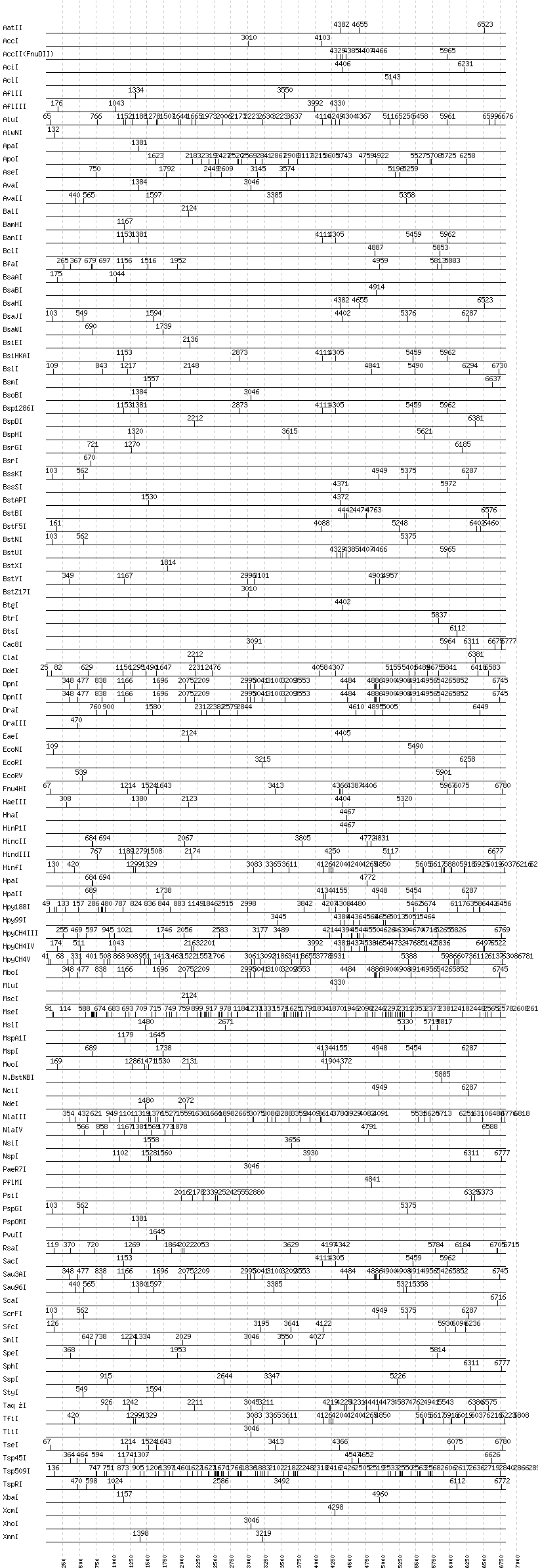 Uncut enzymes: AccIII(BspMII), AfeI, AgeI, AlwI, AlwNI, Aor51HI(Eco47III), ApaI, ApaLI, AscI, AvrII, BaeI, BalI, BamHI, BbsI, BbvCI, BbvI, BcgI, BciVI, BglI, BglII, BlpI, BmrI, BpmI, BsaI, BsaXI, BseRI, BsgI, BsmAI, BsmBI, BsmFI, BspEI, BspMI, BsrBI, BsrGI, BstAPI, BstNI, DraIII, DrdI, EarI, EciI, EcoNI, FauI, FokI, FseI, HaeII, HgaI, HphI, I-CeuI, I-SceI, KasI, MboII, MlyI, MnlI, MscI, NaeI, , NarI, NcoI, NgoMIV, NotI, NruI, PI-PspI, PI-SceI(VDE), PacI, PaeR7I, PflFI, PflMI, PleI, PmeI, PmlI, PshAI, PsiI, PspGI, PspOMI, PvuI, RsrII, SacII, SapI, SbfI, SexAI, SfaNI, SfiI, SfoI, SgrAI, SphI, StuI, TliI, Tth111I, XhoI