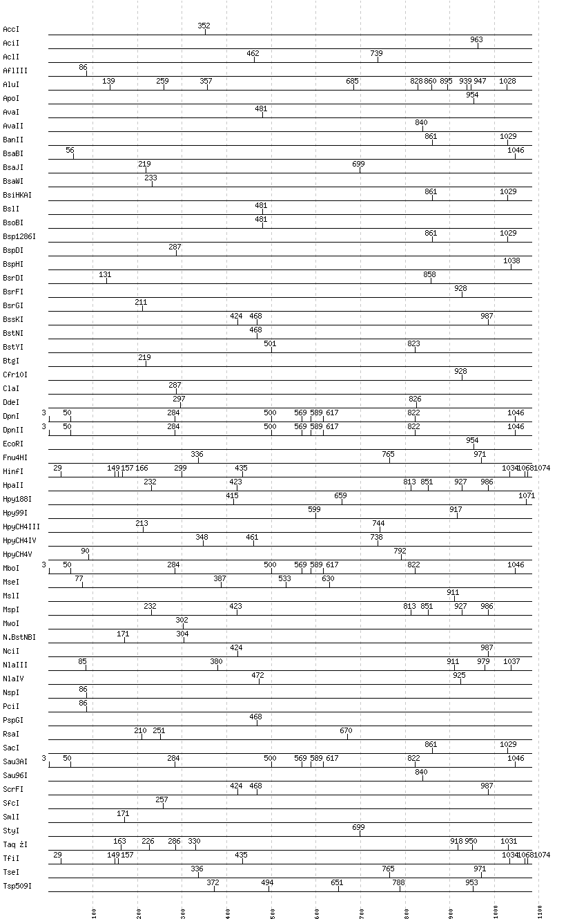 Uncut enzymes: AatII, Acc65I, AccII(FnuDII), AccIII(BspMII), AfeI, AflII, AgeI, AhdI, AlwI, AlwNI, Aor51HI(Eco47III), ApaI, ApaLI, AscI, AseI, AvrII, BaeI, BalI, BamHI, BanI, BbsI, BbvCI, BbvI, BcgI, BciVI, BclI, BfaI, BglI, BglII, BlpI, BmrI, BpmI, BsaAI, BsaHI, BsaI, BsaXI, BseRI, BsgI, BsiEI, BsiWI, BsmAI, BsmBI, BsmFI, BsmI, BspEI, BspMI, BspT107I(HgiCI), BsrBI, BsrI, BssHII, BssSI, BstAPI, BstBI, BstEII, BstF5I, BstUI, BstXI, BstZ17I, Bsu36I, BtrI, BtsI, Cac8I, DraI, DraIII, DrdI, EaeI, EagI, EarI, EciI, EcoNI, EcoO109I, EcoRV, FauI, FokI, FseI, FspI, HaeII, HaeIII, HgaI, HhaI, HinP1I, HincII, HindIII, HpaI, HphI, I-CeuI, I-SceI, KasI, KpnI, MboII, MfeI, MluI, MlyI, MnlI, MscI, MspA1I, NaeI, , NarI, NcoI, NdeI, NgoMIV, NheI, NotI, NruI, NsiI, PI-PspI, PI-SceI(VDE), PacI, PaeR7I, PflFI, PflMI, PleI, PmeI, PmlI, PpuMI, PshAI, PsiI, PspOMI, PstI, PvuI, PvuII, RsrII, SacII, SalI, SapI, SbfI, ScaI, SexAI, SfaNI, SfiI, SfoI, SgrAI, SmaI, SnaBI, SpeI, SphI, SspI, StuI, SwaI, TliI, Tsp45I, TspRI, Tth111I, XbaI, XcmI, XhoI, XmaI, XmnI